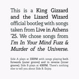 This is a King Gizzard and the Lizard Wizard official bootleg with songs taken from Live in Athens '25. We chose songs from I'm In Your Mind Fuzz and Murder of the Universe. Side A plays at 33RPM with songs playing forwards (outer groove) and in reverse (inner groove). Side B plays at 45RPM. There's nothing else to tell you about Side B. Enjoy.